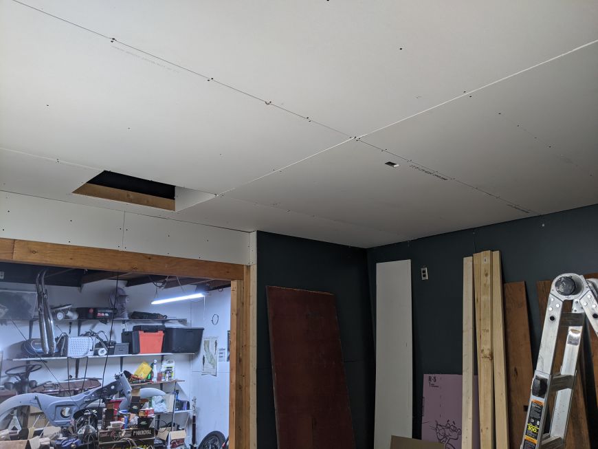 Time for ceiling drywall! I did it ALL BY MYSELF! You see the horizontal 2x4 on the wall that held up one end of 4' x 8' drywall sheet while I held up the other with one hand and screwed it it with the other hand.