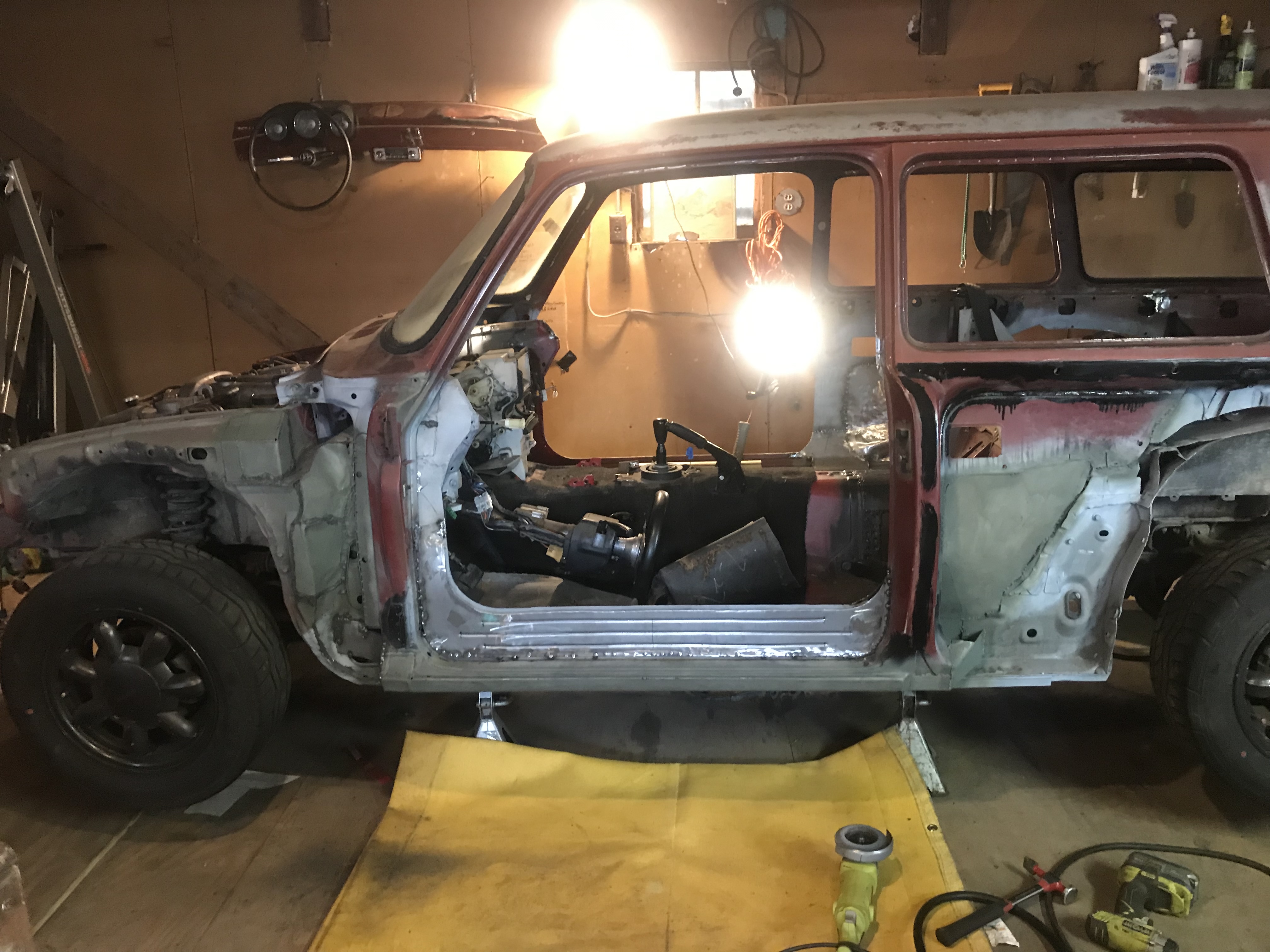 I brought it inside the garage and began working on getting the body into the correct position on the chassis.