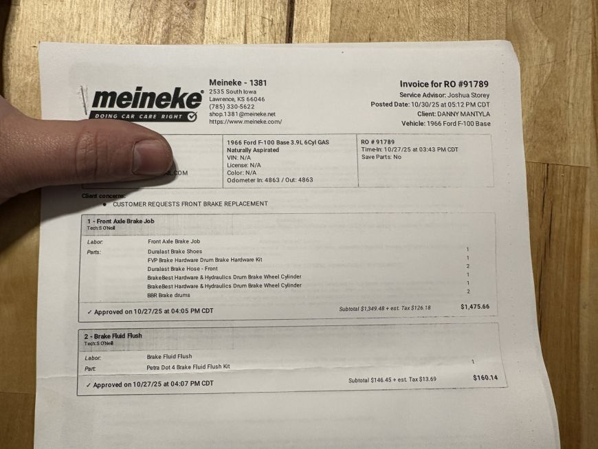 The front brakes were just replaced professionally and still under warranty. I've also recently replaced the battery, starter, turn signal switch, window channels, headliner, and much more. Previous owner replaced the windshield, exhaust system, steering column coupler, side mirrors, and more. The headliner was also added about a year ago. It's just a tapestry but is not glued in, if it doesn't suite you.