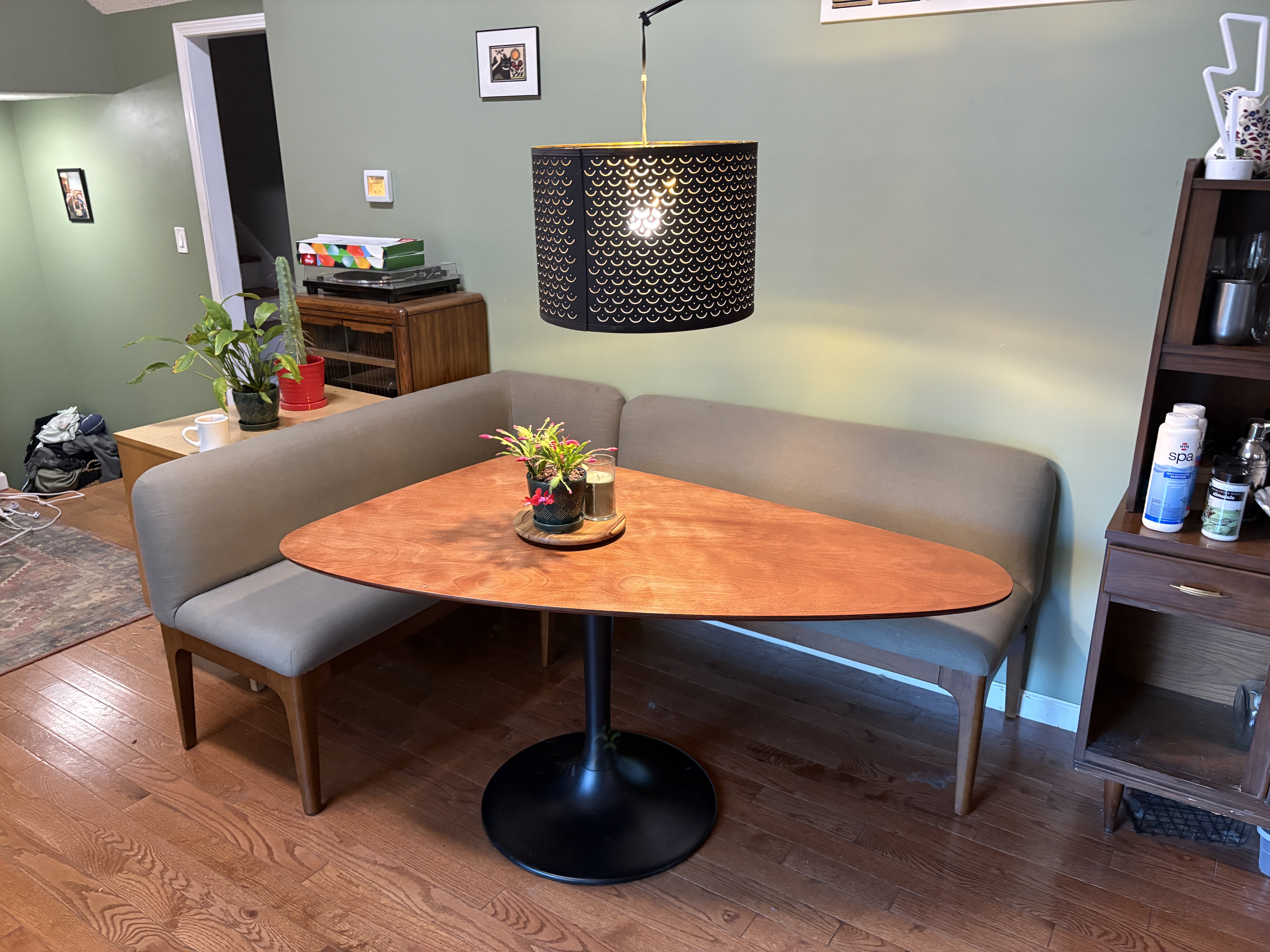 I haven't added a woodworking project to this blog in ages. But we needed a triangular-shaped dining table for our mid-century kitchen remodel. We bought a set of banquet style benches, but our rectangular dining table's legs made it hard to get in and out of the banquet benches, and it was also kind of messing with the flow through the room.