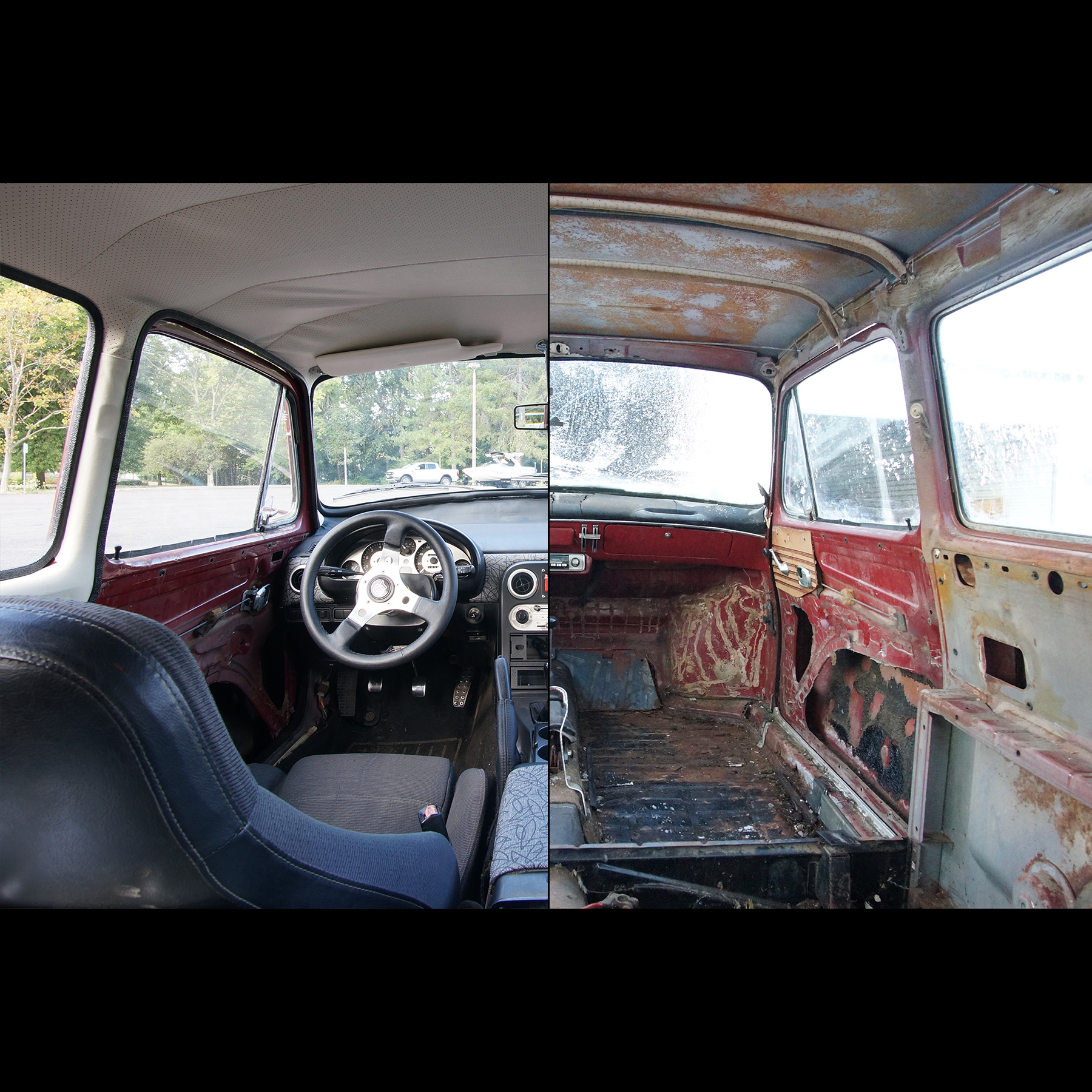 Like I said earlier, the interior is still not completely finished. I need to make the door cards and before I can do that I need to convert the windows from manual crank to electric. But here is a comparison with how it looked before: