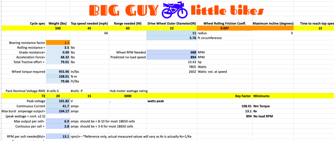 I'm still doing the math on all the EV specs. The another problem with EV conversions: its so much freakin math! I would much rather be wrenching! The EV stuff is all very confusing. I've resigned myself to just copying smarter people than myself and so I'm following two builds on youtube. The first one is about an EV conversion using a '69 Honda CA110. And the other one is an EV conversion with a Honda cub scooter. Both guys are using the same hub motor, so it seems to me that I would be wise to do the same. There's also a very handy spreadsheet and accompanying video for hub motor selection: