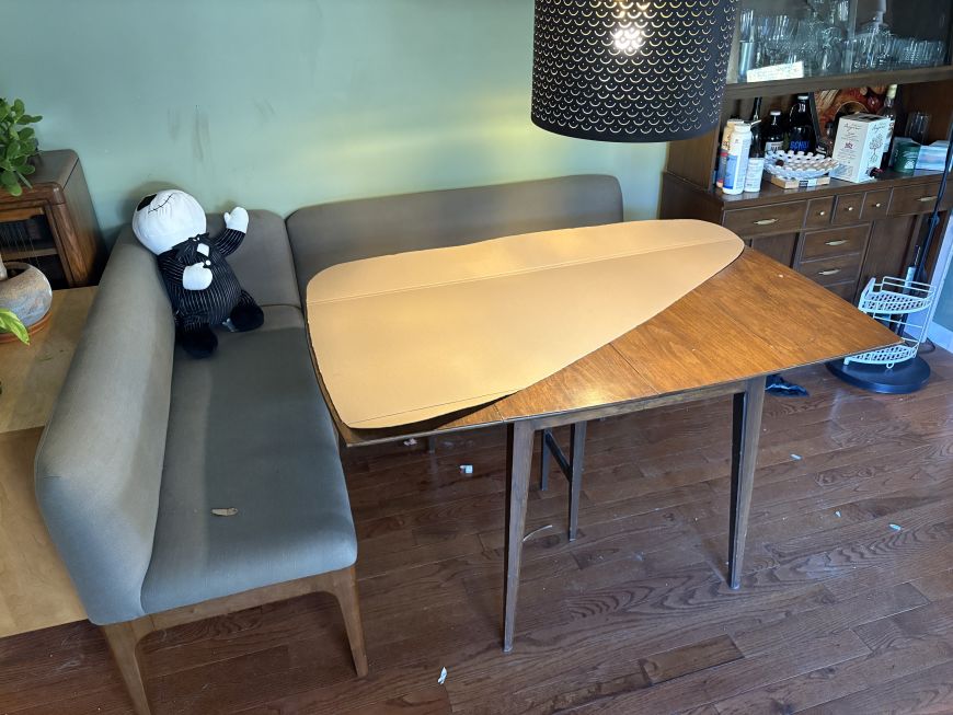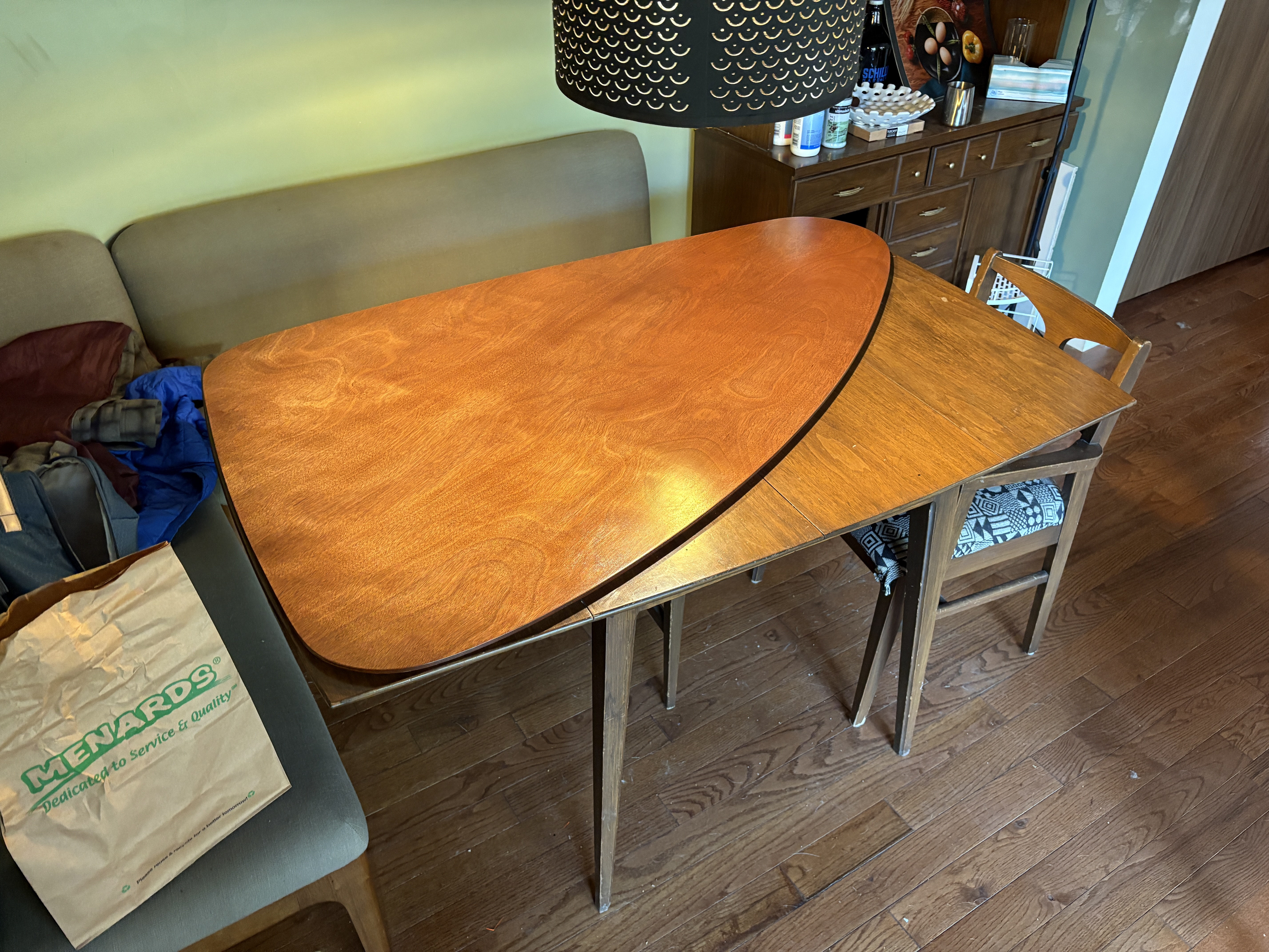 I haven't added a woodworking project to this blog in ages. But we needed a triangular-shaped dining table for our mid-century kitchen remodel. We bought a set of banquet style benches, but our rectangular dining table's legs made it hard to get in and out of the banquet benches, and it was also kind of messing with the flow through the room.