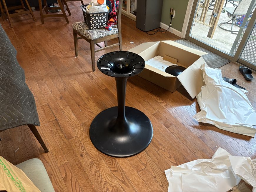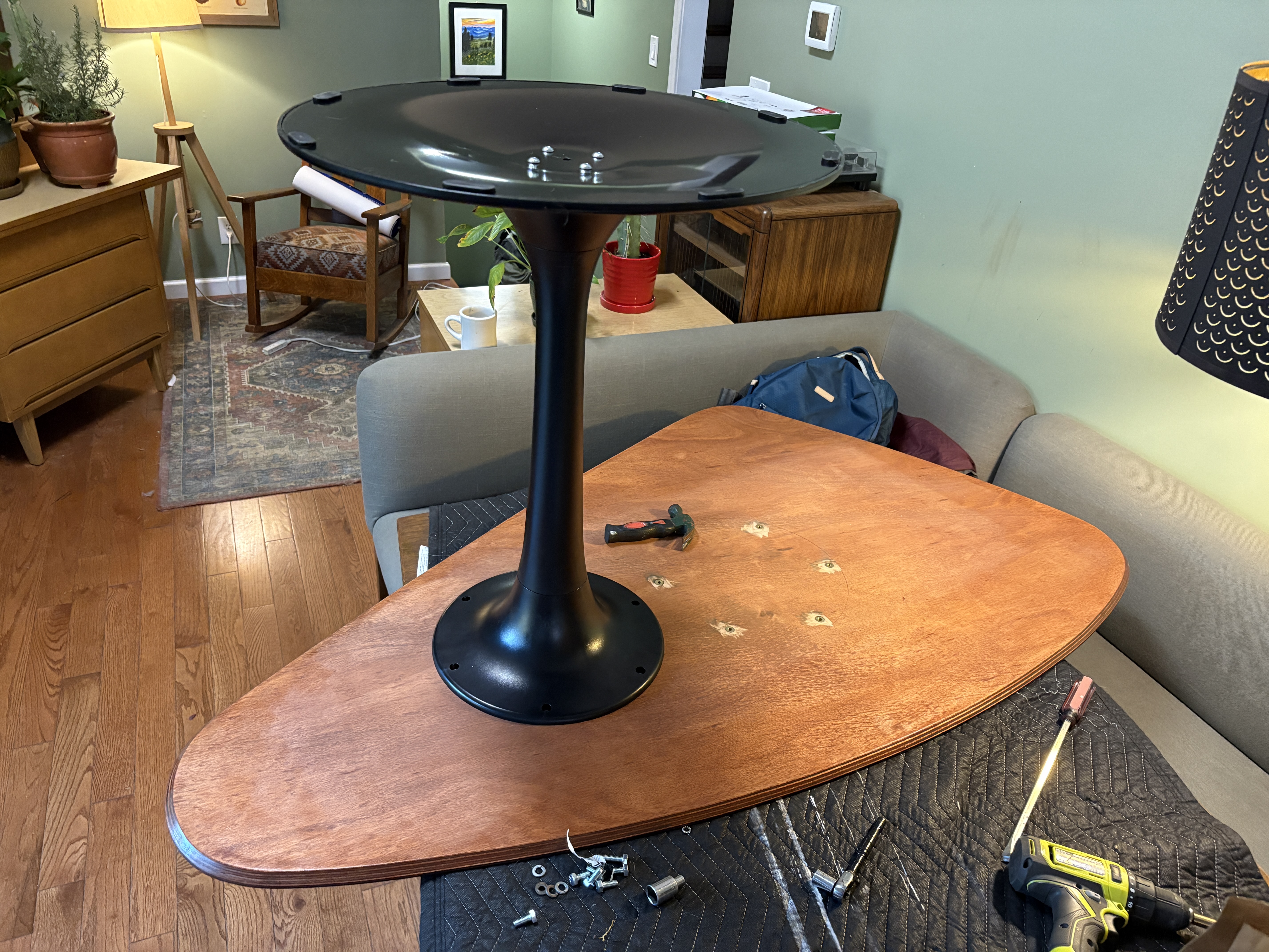 We knew this table really needed a tulip base, but that would have been very difficult for me to make. I would have needed an enormous wood lathe! But Ikea sells these, seperately from the table top, for only around $100.