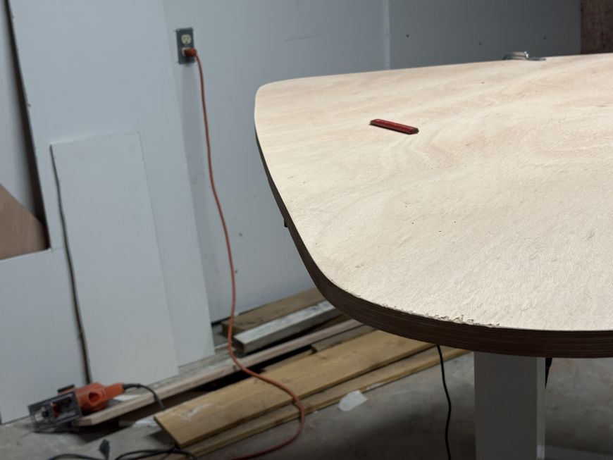 The plan was to get some plywood, cut it out with a jigsaw, and then use a tulip style base. Very easy. However I made a bit of a mistake at the hardware store. I assumed that the most expensive plywood they had ($130), made from most exotic sounding species I've ever hard of (African Okoume), would be a hardwood. Well it turns out that it's actually very soft, softer than hemlock. I was hoping to finish it with Rubio Monocoat for its superior protection from scratches and water damage, but it would have dented and gauged too easily, so I'll have to use polyurethan instead.